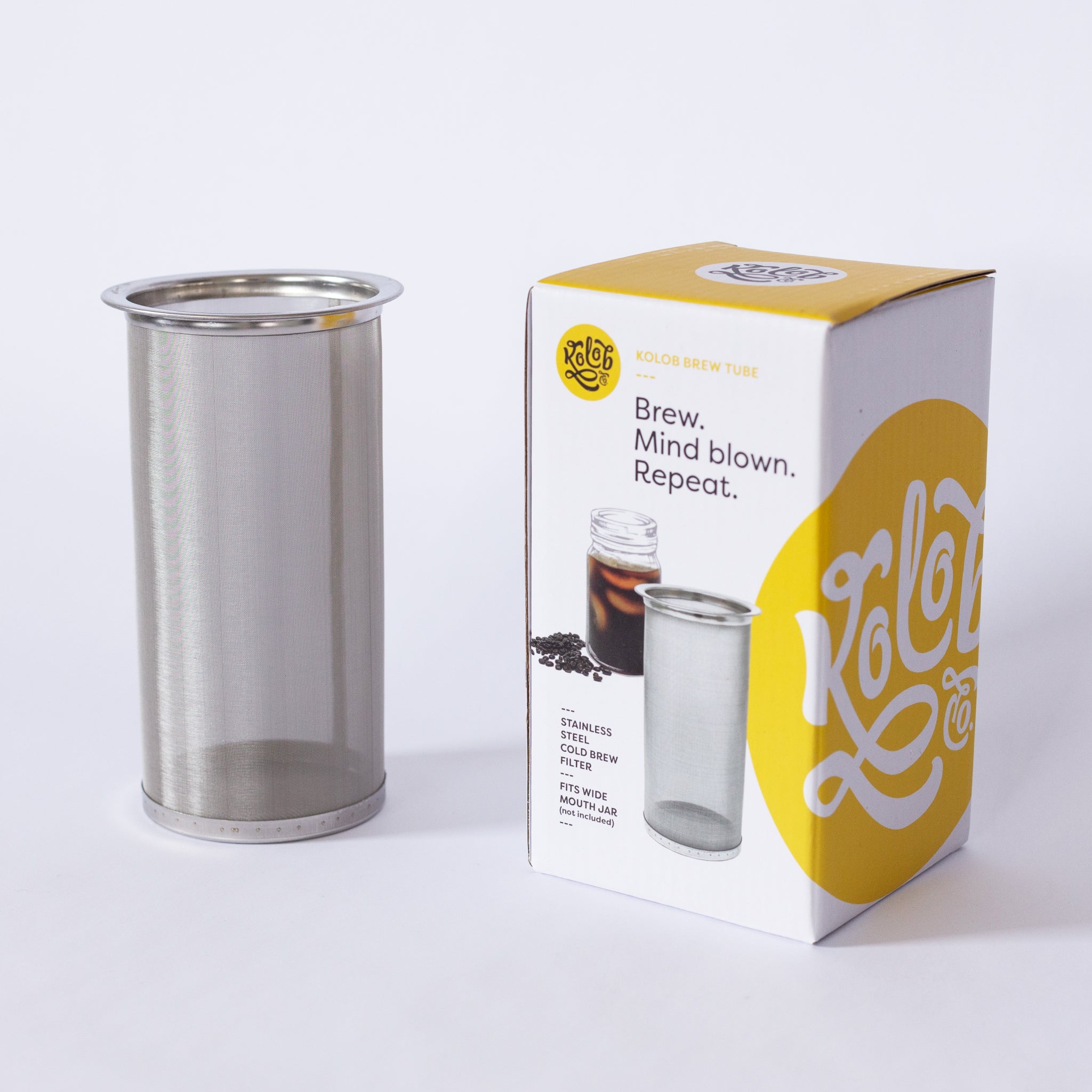 Make Cold Brew coffee at home! The simple-to-use Kolob brew tube is your perfect cold brew coffee maker. The reusable stainless steel brew tube filter fits inside any standard pint, quart, or half gallon wide-mouth jar. Add coffee and water to the filter, let it brew overnight, and then remove the filter. Your own perfect cold brew coffee pitcher – every time.