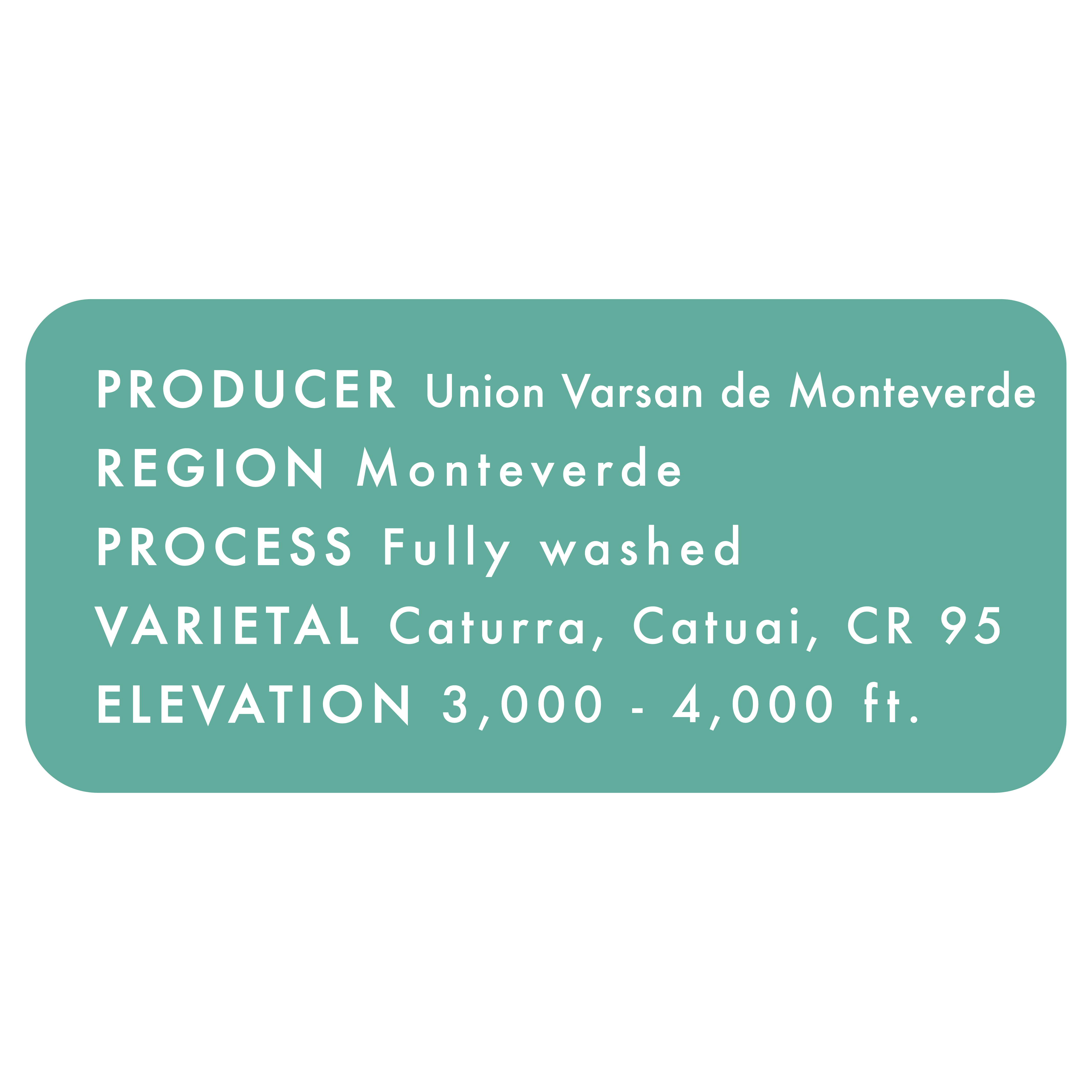 Grown in the cloud forest of Monteverde, Costa Rica, this coffee thrives in cool temperatures beneath the natural canopy of shade trees. The diverse climate allows the coffee to ripen slowly, developing flavors that exhibit and represent quality. After the coffee is selectively handpicked, it is processed at a nearby wet mill and then sun-dried on patios and shaded raised beds.