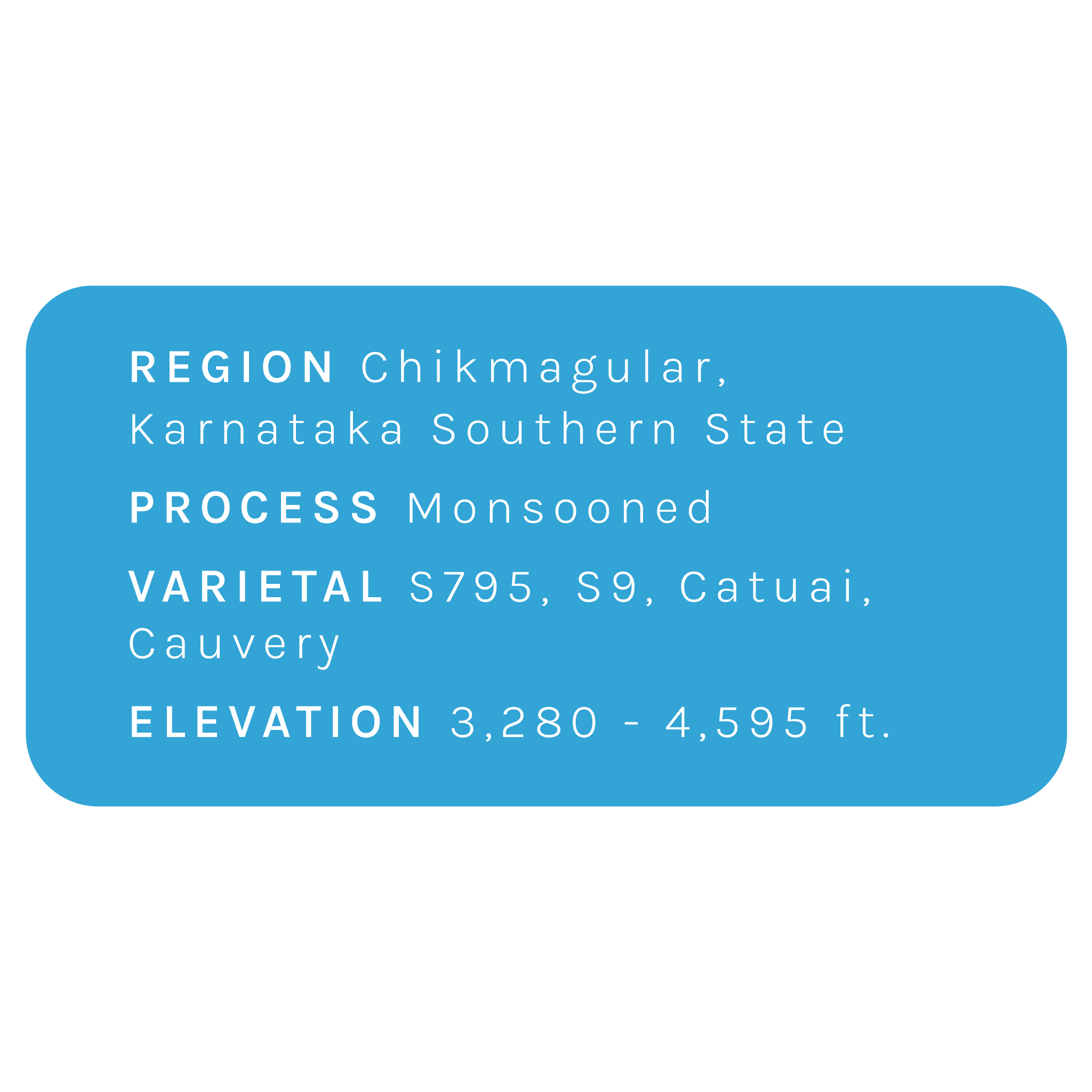 Monsooned Malabar is a processing method unique to the Malabar Coast of Karnataka. Typically the coffee is naturally processed and then transported to the Malabar coast for 3 to 4 months, where the beans are exposed to monsoon rain and winds - June through September - in well ventilated warehouses. During this time, the beans swell in size and become pale gold in color, replicating this coffee’s historical journey on wooden sailing vessels from India to Europe. The resulting flavor of the coffee is deep and big-bodied, with earthy and cocoa notes.