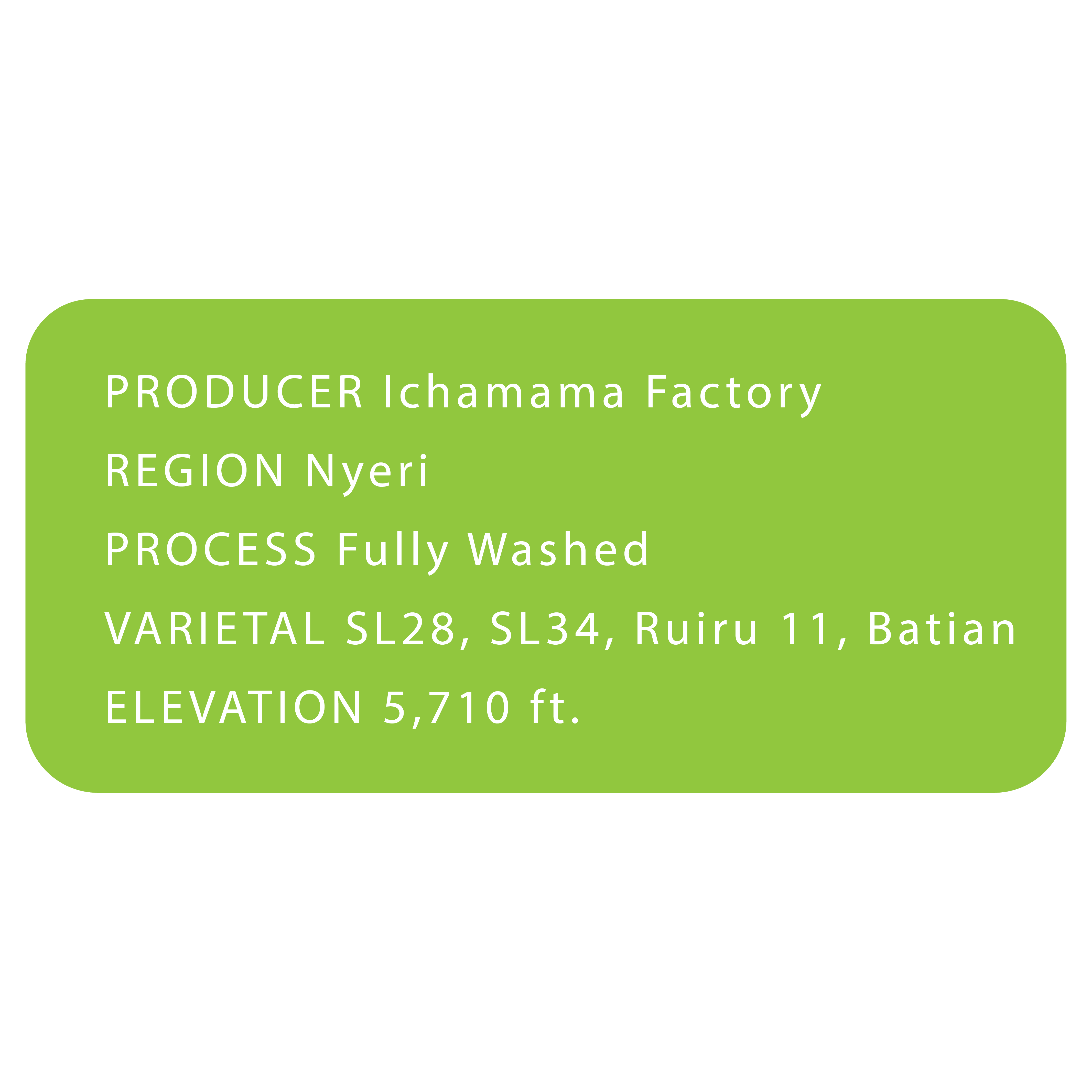 This coffee is sourced from farmers organized by the Ichamama Factory, a wet mill in the Nyeri region near the Aberdare Mountain range. Managed by the Othaya Farmers Co-operative Society, the factory processes coffee from smallholder farmers with about half-acre plots, typically growing 250 coffee trees shaded by banana, gravelia, and macadamia trees.